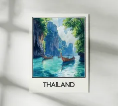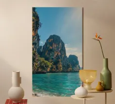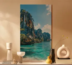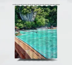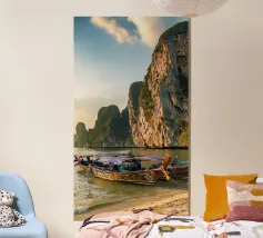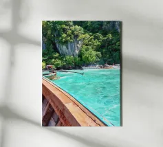 Vista da una barca in Thailandia con montagne verdi e acqua turchese