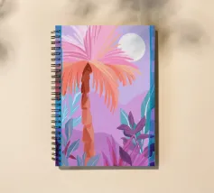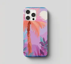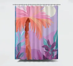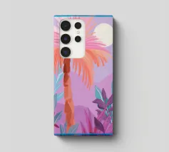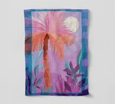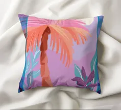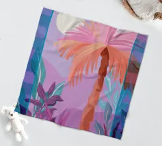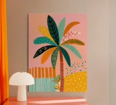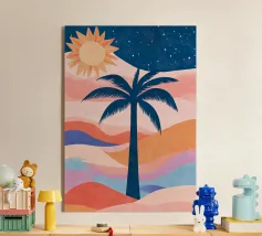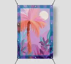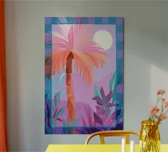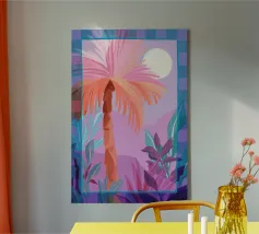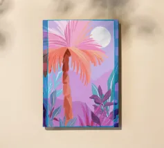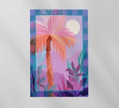 Allegra illustrazione dipinta di un paesaggio colorato con una palma e altre belle piante. Si ha subito la sensazione di calde serate estive in un ambiente tropicale. La tavolozza dei colori è una combinazione di colori caldi e freddi.