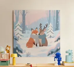 La volpe Voxy abbraccia dolcemente il suo piccolo amico di neve sotto il sole invernale. Colori tenui, impronte giocose e un'accogliente scena innevata rendono quest'opera d'arte perfetta per le camerette dei bambini, le nursery e gli amanti dell'arredamento invernale. Un'illustrazione che fa sciogliere il cuore, piena di amicizia e calore.