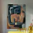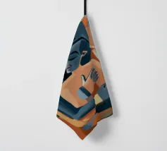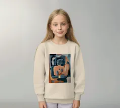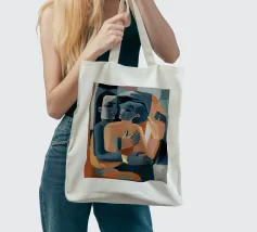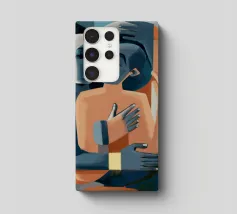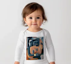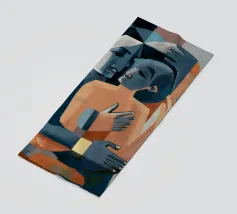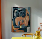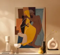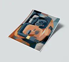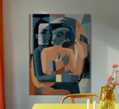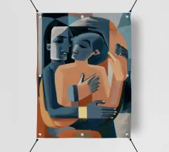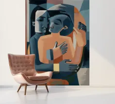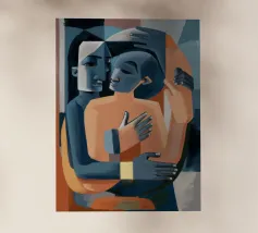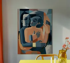 Il dipinto raffigura due figure astratte che si abbracciano. Le figure sono composte da forme geometriche e colori tenui, principalmente tonalità di blu, arancione e beige. Le forme sovrapposte e l'uso di colori contrastanti creano un senso di profondità e intimità.