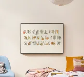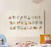 Poster inglese ABC - acquerello e tipografia. A sta per mela, B sta per mirtillo...