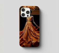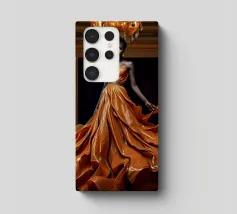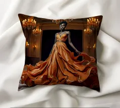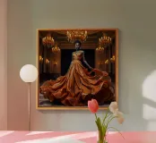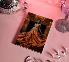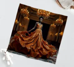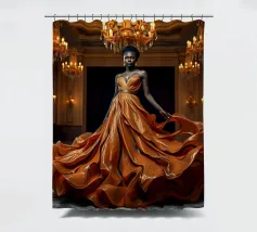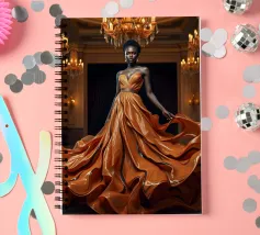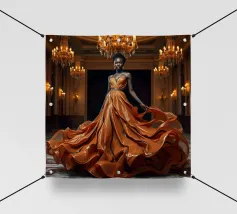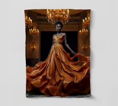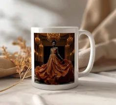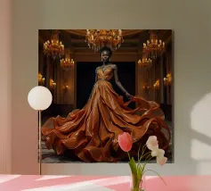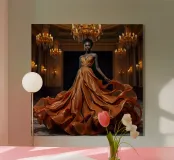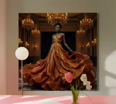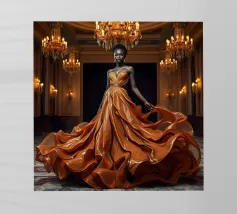 Abito da caffè: Fotografia surreale di alta moda Un'immagine suggestiva di una modella nera in una sala da ballo che indossa un abito fluente fatto di caffè vorticoso. L'immagine evoca una fotografia surreale di alta moda con colori vibranti e dettagli intricati.