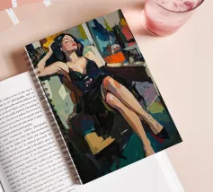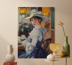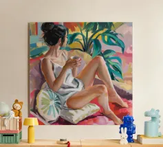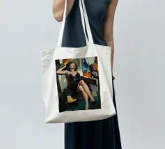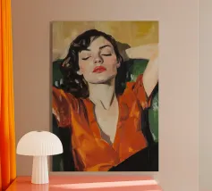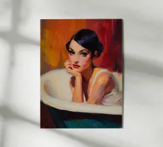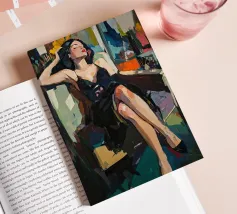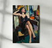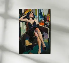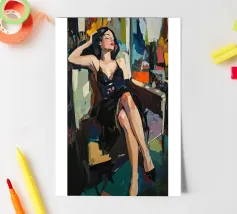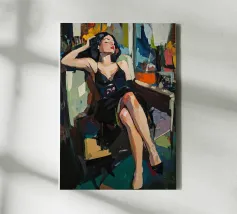 Dipinto a olio di una bella donna in abito nero seduta su una sedia. Con una mano si tocca i capelli e con l'altra tiene una bottiglia di vetro. Indossa scarpe con il tacco e guarda l'osservatore con un'espressione felice. Lo sfondo è colorato, con pennellate visibili. Il dipinto ha uno stile astratto con colori a olio.