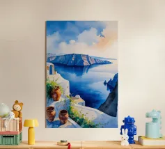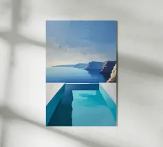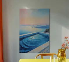 Questo dipinto a olio fonde minimalismo astratto e realismo, concentrandosi su una piscina a sfioro che si affaccia su scogliere drammatiche. Gli spigoli geometrici della piscina si contrappongono alla naturale asprezza delle scogliere, mentre l'acqua calma ne riflette la consistenza. I toni chiari della composizione amplificano l'atmosfera di tranquilla raffinatezza, celebrando l'intersezione tra design e natura. L'orizzonte si estende all'infinito, incoraggiando l'introspezione e l'immersione nella scena sconfinata.