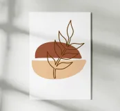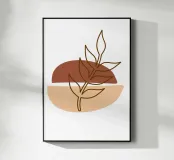 Una composizione astratta presenta un semplice sfondo geometrico marrone e beige con un delicato disegno al tratto di un ramoscello frondoso. Il design minimalista enfatizza gli elementi naturali in un equilibrio armonioso.