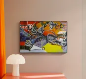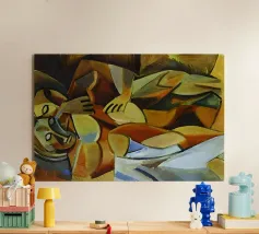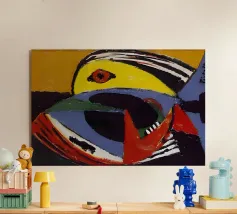 Questo dipinto astratto vibrante ed energico presenta un gioco dinamico di forme frammentate e linee audaci, con una ricca tavolozza di arancioni, gialli, viola e blu. La composizione suggerisce elementi decostruiti, forse figure o oggetti, in un movimento vorticoso ed energico, caratteristico delle influenze cubiste ed espressioniste astratte. I dettagli intricati e i colori contrastanti creano un'esperienza visiva accattivante e stimolante. Questo poster digitale di alta qualità (7000x5000 pixel, 300 dpi) cattura magnificamente l'energia grezza e il genio artistico dell'originale, ma