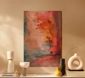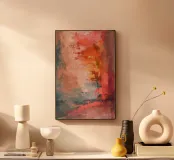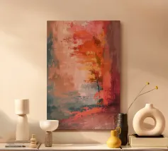 A vibrant and dynamic digital oil painting showcasing vivid brushstrokes in a beautiful swirl of warm and cool tones. The thick, textured strokes create a sense of motion and depth, evoking emotion and energy. The striking contrast between the bright oranges, reds, and blues forms a captivating visual, inviting the viewer to explore its rich texture and expression. A perfect piece for those seeking to add an abstract and energetic atmosphere to their space.