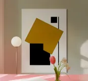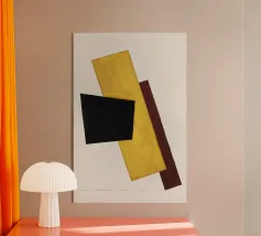 A striking abstract composition inspired by Bauhaus design, featuring bold red and black geometric forms arranged in a dynamic balance. Clean lines and strong contrasts create a timeless modern aesthetic.