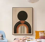 This modern design impresses with its harmonious combination of geometric shapes and warm earthy colours. The black circle and the curved arch form a timeless composition that combines elegance and minimalism. Perfect for murals, home accessories or fashion items to make a stylish statement in any room. Ideal for lovers of contemporary and abstract art.