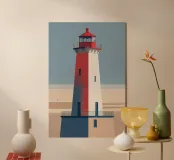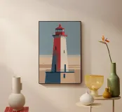 Questa moderna illustrazione del faro di Hörnum adotta un approccio unico al colore e alla forma, creando un'impressione visiva minimalista ma potente. Le tonalità rosse e bianche della struttura sono accostate a uno sfondo accuratamente composto di blu tenui e neutri sabbiosi, che imitano i toni del paesaggio costiero del Mare del Nord. Con le sue linee pulite e l'influenza astratta, questo pezzo cattura lo spirito della cultura marittima di Sylt in modo contemporaneo e senza tempo.