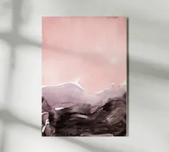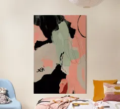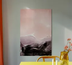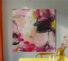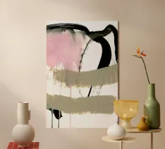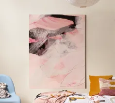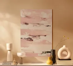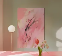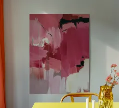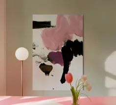 Ampia pittura astratta gestuale nei toni del rosa, del magenta, del marrone, del nero e del grigio con pennellate smaltate beige chiaro.