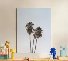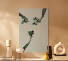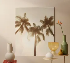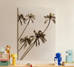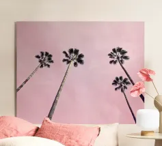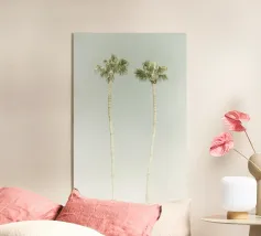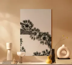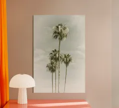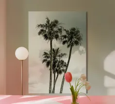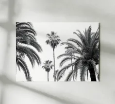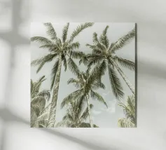 Lasciatevi trasportare dall'eleganza e dalla maestosità di queste palme imponenti. Mentre le loro cime formano un disegno circolare contro un cielo morbido e pastello, sentite la pace e la calma che offre la natura. Questa angolazione insolita non solo mette in risalto l'altezza degli alberi, ma anche la loro bellezza senza tempo.