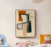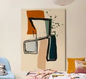 Forme astratte e pennellate decise nei toni della terra si combinano con uno sfondo chiaro. La composizione presenta rettangoli sovrapposti e schizzi a forma libera, creando un look dinamico e moderno.