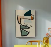 Forme astratte e linee decise si fondono in un equilibrio di colori tenui, creando una composizione dinamica. Le forme organiche si intrecciano, mentre sprazzi di verde aggiungono profondità e movimento.