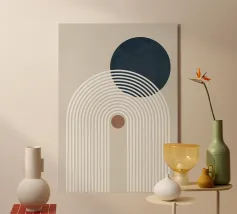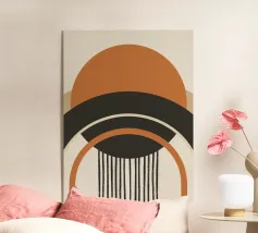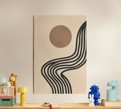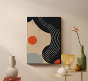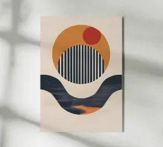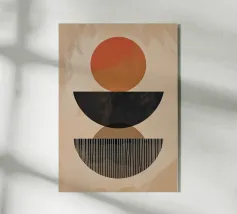 Forme e linee astratte creano una composizione avvincente, con cerchi rossi e grigi in contrasto con uno sfondo beige e nero. Le linee curve aggiungono movimento dinamico, mentre le texture maculate conferiscono profondità.
