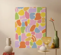 Un motivo astratto vivace e giocoso presenta forme colorate sparse come scaglie di terrazzo su uno sfondo neutro, creando un design festoso e moderno.