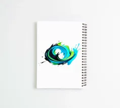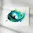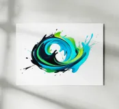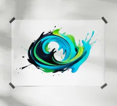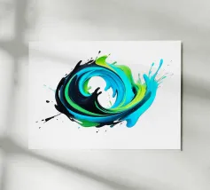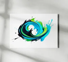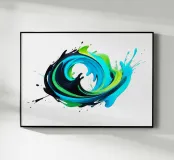 Questo dipinto dinamico e astratto raffigura un'esplosione vorticosa e tridimensionale di colori che ricorda un'onda o una spirale. Le forme sono composte da colori dall'aspetto fluido in tonalità vibranti: ciano intenso, turchese brillante e verde lime elettrico, intervallati da un nero lucido a contrasto. I colori fluiscono l'uno nell'altro in un movimento energico e schizzano verso l'esterno. La rappresentazione è lucida e iperrealistica, isolata su uno sfondo bianco puro, che enfatizza il dinamismo del turbinio di colori.