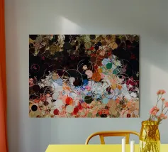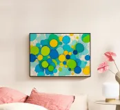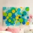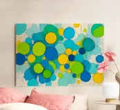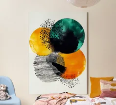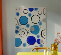 Quest'opera astratta presenta una vivace composizione di numerosi cerchi di diverse dimensioni. La tavolozza dei colori è dominata da un giallo brillante, un blu intenso e un fresco verde lime, completati da toni più chiari di turchese e ciano. I cerchi si sovrappongono parzialmente, creando una certa profondità e trasparenza. Lo sfondo è luminoso e infuso di spruzzi di colore dinamici e linee sottili e veloci che aggiungono una texture vivace ed energica. L'immagine emana un'allegria giocosa e moderna.
