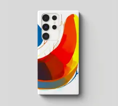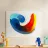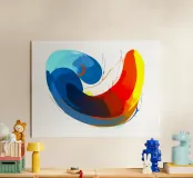 Questo dipinto astratto presenta una forma dinamica e curva che sembra quasi un vortice o un boomerang molto stilizzato. La combinazione di colori è intensa e ricca di contrasti, composta principalmente da toni caldi come il rosso e il giallo acceso sulla destra e da blu freddi (dal blu chiaro al blu intenso) sulla sinistra. I colori fluiscono dolcemente l'uno nell'altro, con pennellate visibili che creano una texture vivace. La forma è isolata al centro sullo sfondo bianco e crea una forte energia visiva grazie al suo movimento e all'intensità dei colori.