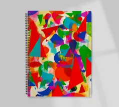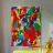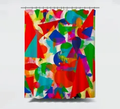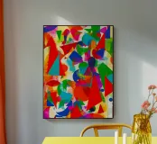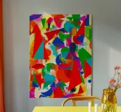 Questo caotico ed energico dipinto astratto è una densa composizione di forme geometriche sovrapposte, principalmente triangoli e cerchi. La tavolozza dei colori è estremamente luminosa e copre l'intero spettro: colori primari come il rosso e il blu, integrati da verde, giallo e magenta. Le forme appaiono parzialmente trasparenti, creando un complesso effetto di profondità. Lo sfondo è luminoso e inquieto, attraversato da pennellate verticali. La composizione è esplosiva e ricorda una giungla urbana astratta.