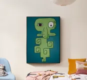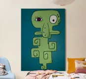 Un personaggio verde semplificato e astratto su uno sfondo giallo-arancio, ispirato allo stile "Bold and Brash" di Squidward.