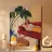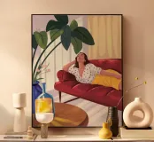 Questo dipinto mostra una persona che si sdraia su un divano rosso in un accogliente salotto. La persona indossa una camicia bianca a pois e pantaloni gialli. Sullo sfondo ci sono piante e una lampada che contribuiscono a creare un'atmosfera confortevole e invitante.