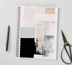Collage astratto a tecnica mista di elementi di carta e pittura, moderno e nordico nella combinazione di colori, dall'eleganza minimalista. Campi di colore in beige, nero, azzurro, grigio e bianco trasparente. L'alternanza tra superfici opache, strutturate e traslucide crea una composizione armoniosamente equilibrata con un tocco idiosincratico.