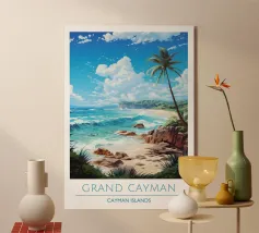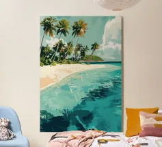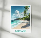 Affiche Barbade illustrant une plage de sable fin bordée de palmiers avec des falaises en arrière-plan. Une scène tropicale apaisante, parfaite pour une décoration murale ensoleillée et exotique.