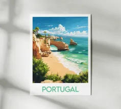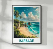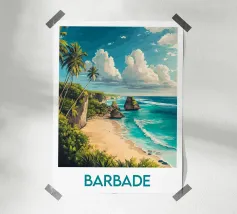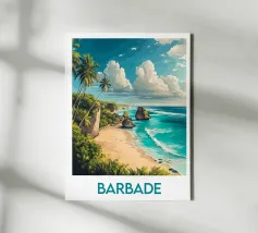 Affiche Barbade mettant en valeur une plage bordée de falaises et de formations rocheuses spectaculaires, avec des palmiers tropicaux. Une illustration saisissante idéale pour une décoration murale exotique et inspirante.