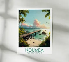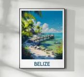Un'illustrazione paradisiaca di un pontile di legno su una spiaggia del Belize, circondato da palme e da un mare turchese. Un poster di viaggio rilassante, ideale per creare un'atmosfera esotica e naturale nella vostra casa.