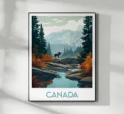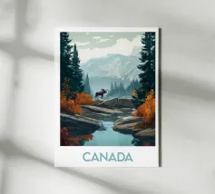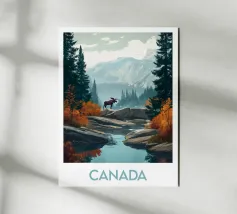 Un alce maestoso si trova sulle rocce accanto a un fiume tranquillo, circondato da abeti e colori autunnali, con le montagne canadesi sullo sfondo. Un'illustrazione selvaggia e poetica.