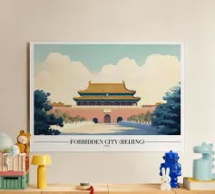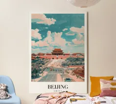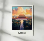 Ammirate la maestosità della Cina con questo poster che raffigura un palazzo imperiale nel cuore di un parco verdeggiante, illuminato da un sontuoso tramonto. Una miscela armoniosa di storia antica e paesaggio urbano moderno.