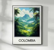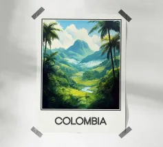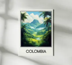 Esplorate la natura lussureggiante della Colombia con questo poster che raffigura una valle tropicale circondata da montagne maestose e palme imponenti. Una celebrazione della biodiversità e della bellezza naturale del cuore del Sud America.