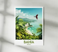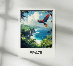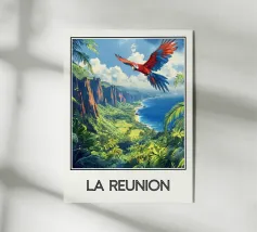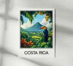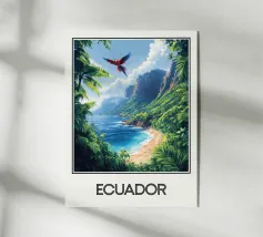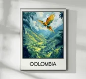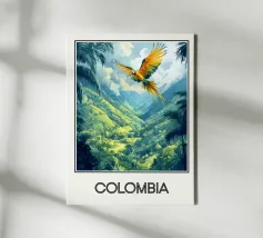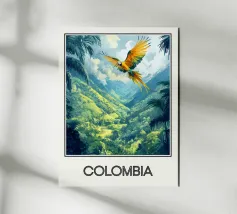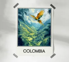 Ammirate lo splendore della Colombia con questo poster che raffigura un maestoso pappagallo che vola su una valle verdeggiante, circondata da montagne e palme. Un'ode alla biodiversità e alla natura esuberante di questo affascinante Paese.