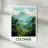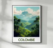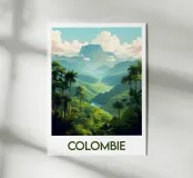 Questa lussureggiante illustrazione raffigura un paesaggio colombiano dove la giungla tropicale incontra le vette andine. Un fiume serpeggia tra le colline, costeggiato da palme e vegetazione abbondante. Un poster ideale per un'ambientazione esotica e naturale.