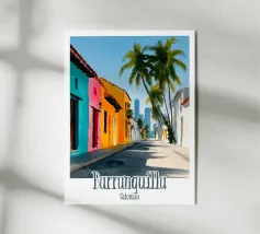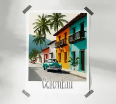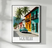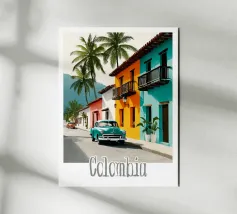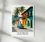 Una strada colombiana fiancheggiata da case colorate e palme, con un'auto retrò che richiama la calda atmosfera di altri tempi. Un poster dal fascino tropicale e nostalgico.