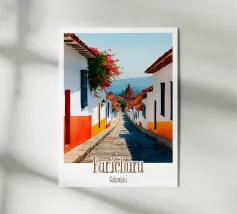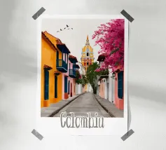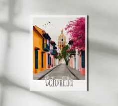 Un vicolo colorato in Colombia, fiancheggiato da fiori tropicali e sovrastato da una cupola emblematica. Un'illustrazione sorprendente che riflette l'anima coloniale e festosa del Paese.