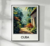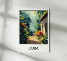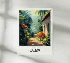 Lasciatevi sedurre dalla magia di Cuba con questo poster che raffigura un sentiero soleggiato fiancheggiato da piante rigogliose, palme e fiori colorati, che conduce a un'affascinante gabbia decorativa nel cuore di un giardino tropicale. Un'ode al fascino esotico dell'isola.