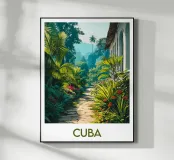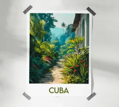 Una calda illustrazione di un sentiero di pietra delimitato da un giardino lussureggiante a Cuba, di fronte a una casa coloniale con le persiane aperte. Una decorazione murale perfetta per portare esotismo e relax nella vostra casa.