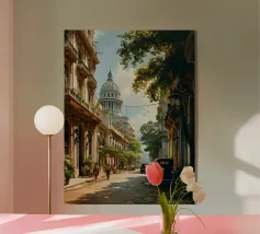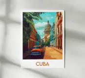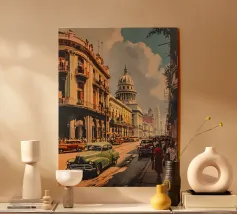 Illustration vibrante du Capitole de La Havane avec une voiture ancienne rouge au premier plan. Cette affiche capture l’essence rétro et ensoleillée de Cuba, idéale pour une décoration murale colorée et vintage.