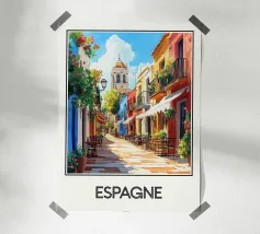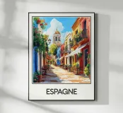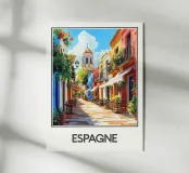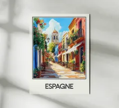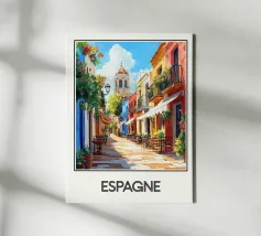 Poster che illustra una pittoresca strada della Spagna, ornata da facciate colorate, balconi fioriti e una calda atmosfera sotto un cielo soleggiato. Una vivace scena mediterranea che emana gioia di vivere e invita a passeggiare per le sue stradine.