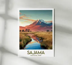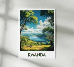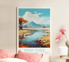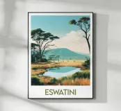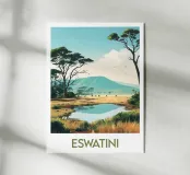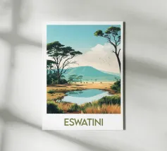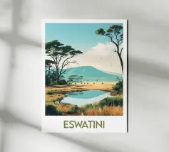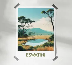 Poster di viaggio che raffigura un paesaggio naturale in Eswatini, con savana, montagne e pozze d'acqua. Un'illustrazione ideale per gli amanti della natura selvaggia e dell'evasione africana. Perfetto per decorare un salotto o un ufficio con un tocco di avventura.
