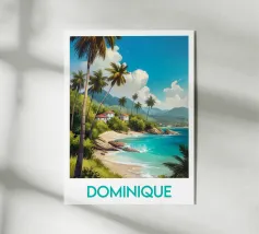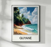 Poster decorativo che raffigura una spiaggia selvaggia della Guyana francese, circondata da scogliere rossastre e palme rigogliose, con onde turchesi che si infrangono sulla sabbia dorata. Un paesaggio tropicale accattivante, perfetto per creare un'atmosfera esotica e rilassante nella vostra casa.