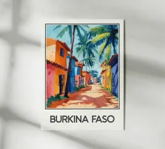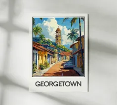 Admirez une charmante scène en Guyane, où des maisons aux façades colorées et un clocher doré se dressent au cœur d'une végétation luxuriante. Entourée de palmiers majestueux et baignée de lumière tropicale, cette vue évoque la tranquillité et la chaleur culturelle de la région.