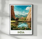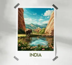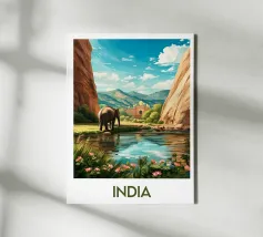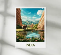 Poster di viaggio raffigurante l'India con un maestoso elefante accanto a un fiume, incorniciato da montagne e da un palazzo orientale sullo sfondo. Un'illustrazione accattivante per gli amanti dei paesaggi esotici e della cultura indiana.