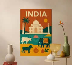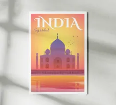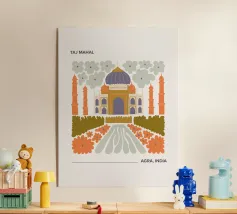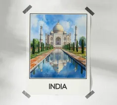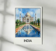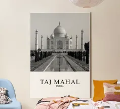 Un'elegante illustrazione del Taj Mahal, simbolo di amore e grandezza, con il suo accattivante riflesso nella piscina circostante. Un omaggio all'architettura e al patrimonio indiano, perfetto per una decorazione murale raffinata e senza tempo.