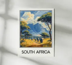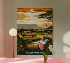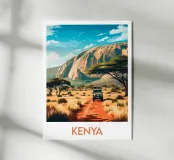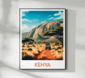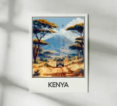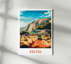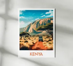 Poster di viaggio che illustra un safari in Kenya, con un veicolo 4x4 che attraversa una savana dorata circondata da acacie e dominata da un'imponente montagna. Un'illustrazione da parete ideale per gli amanti della natura selvaggia, dei safari africani e dei paesaggi esotici. Dona un tocco di avventura al tuo arredamento.