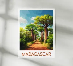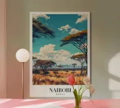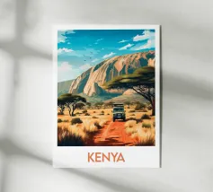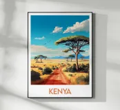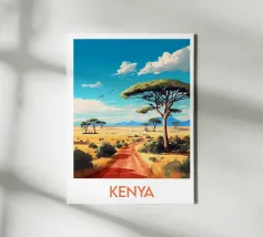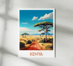 Poster di viaggio raffigurante una pista rossa che attraversa la savana del Kenya, con maestosi alberi di acacia sotto un cielo blu intenso. Un'illustrazione ideale per gli amanti dell'Africa, dei grandi spazi e della natura selvaggia. Porta il calore e l'evasione nella tua decorazione murale.