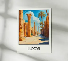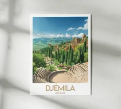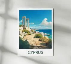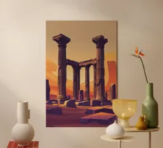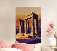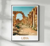 Poster di viaggio che illustra le antiche rovine di Leptis Magna in Libia, con le sue colonne romane e i maestosi archi sotto un cielo limpido. Un'illustrazione da parete ideale per gli appassionati di storia, archeologia e civiltà mediterranee. Perfetta per decorare con un tocco di antica grandezza.