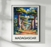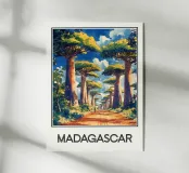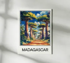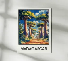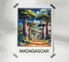 Scoprite la maestosità del Madagascar con questa illustrazione dell'iconica Allée des Baobabs, dove questi imponenti alberi costeggiano una strada rossa sotto un cielo brillante. Una scena esotica e ammaliante, perfetta per una decorazione naturale ed esotica.